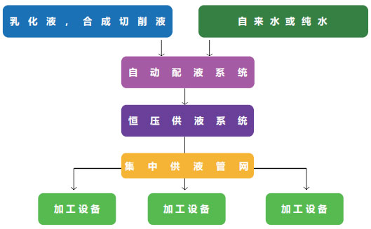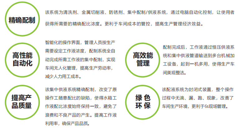 该配制/供液系统通过电脑精准控制,使工作液配比浓度始终保持一致,避免浪费和不良品的产生,解决了国内外机械加工制造企业存在的单机工作液配制繁琐,费时费工,配比不精确的弊端。使用户一机多用地进行数种加工液同时、准确、安全、自动化配制,具有广泛应用的效果。