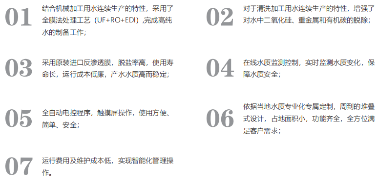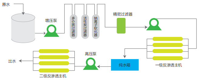 该设备在预处理阶段采用多介质过滤器、活性炭过滤器、钠离子软化床去除泥沙、余氯、悬浮物、部分重金属离子,通过精密过滤器拦截水体中胶体、小颗粒,经过反渗透膜(RO膜)去除水体中绝大部分离子,脱盐率可以达到98.5%以上,二级反渗透膜再次脱盐,超纯水电导率可以达到在5μS/cm以下。